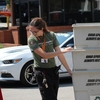Student rides the smoothie bike at the UT Earth Day festival to learn about clean energy.