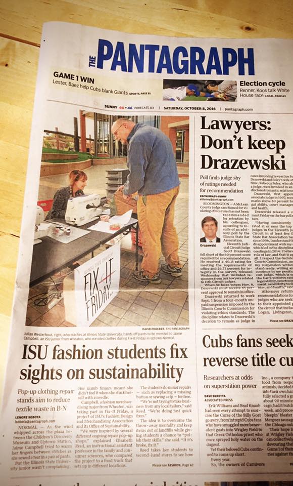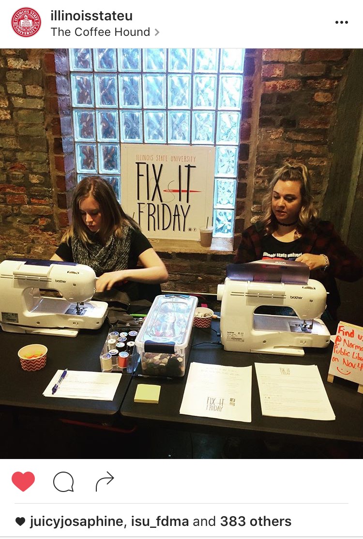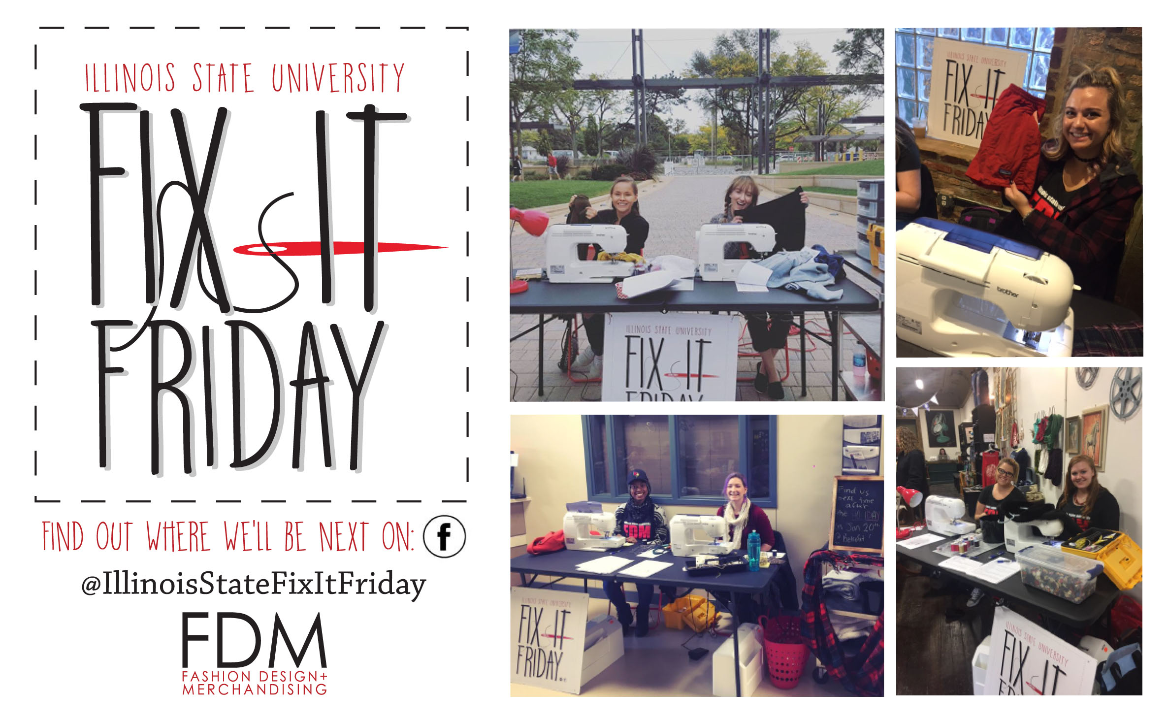 Fix It Friday is a program in which fashion students set up sewing machines in various places within the Illinois State University campus and the surrounding Bloomington-Normal community and offer FREE basic sewing, mending and clothing repair services to anyone in need. The fashion students lend their time, talent, and skills on a completely volunteer basis.