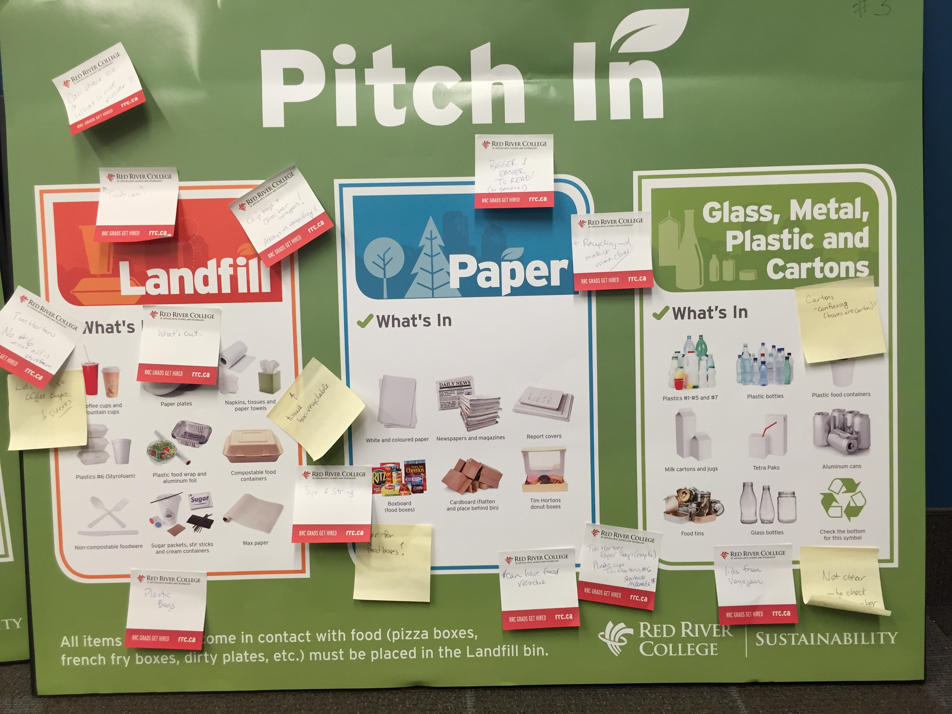 Red River College (RRC) launched Pitch In, our comprehensive hallway waste and recycling program, in 2011. The program places trios of bins (1 for landfill waste and 2 for recycling) in strategic locations around the College’s hallways, many of which are accompanied by Pitch In signs explaining what items go in which bin. The concept behind “Pitch In” is two-pronged: it shows students and staff where to “pitch” their waste and recyclables and also reminds us that the program can only be successful if we all “pitch in” and do our part. Although there has been good uptake at the College on recycling, many items consistently end up in the wrong stream.