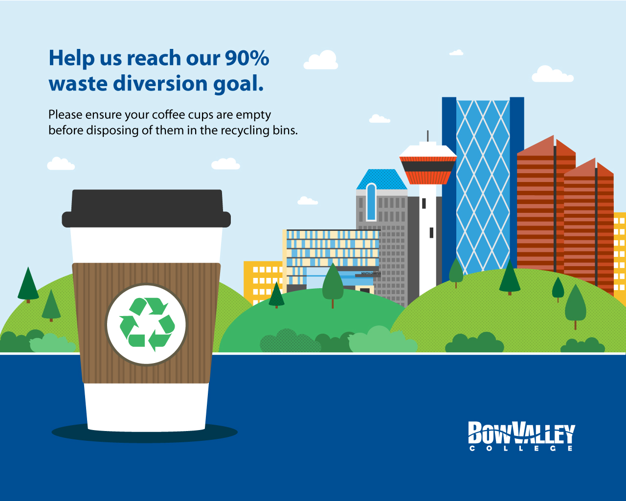 In 2016, a recycling bylaw came into effect for the city of Calgary. This was followed by mandatory composting programs for all institutions in 2017. In response to this bylaw, Bow Valley College implemented four-stream waste stations around the college (landfill, organics, mixed recycling, and bottles & cans) and removed all individual garbage cans across the college. Once we saw our diversion rate skyrocket, we wanted to continue and get as close to zero-waste as possible.