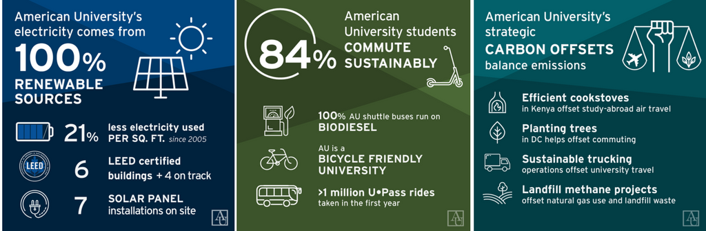 2008 President Kerwin signs the American College & University Presidents Climate Commitment 2009 Creation of the Office of Sustainability 2010 AU adopts a Sustainable Purchasing Policy 2011 Completed AASHE STARS report and earned Silver 2011 AU’s First LEED Certified Building: SIS 2011 AU begins purchasing 100% Renewable Energy Credits 2012 President Kerwin signed the District of Columbia Mayor's College and University Sustainability Pledge 2012 Green Office program launches 2014 Partnered with George Washington University and George Washington University Hospital to launch the Capital Partners Solar Project PPA. The project includes 250,000+ solar panels in North Carolina, within the PJM grid, which provide each partner with 50% of our electricity 2015 AU hosted DC's first-ever Tree Summit in 2015 and is a partner organization of Canopy 3,000 2016 AU earns STARS Gold 2016 AU becomes first school in DC to partner with WMATA and provide U•Pass to students for unlimited Metro rides at a set semester-based rate 2016 AU becomes charter signatory to the Climate Commitment through Second Nature 2016 Gray Hall Received LEED Silver Certification, first LEED Existing Building 2017 Cassell Hall is the first residence hall to earn LEED Certification 2017 AU Partners with Veteran-Owned Composting Firm Veteran Compost 2017 President Burwell signs “We Are Still In” in response to the US withdrawal from the Paris Climate Accord 2017 Offset Study Abroad through procurement of offsets that fund efficient cookstoves in Kenya, which is the home of one of AU’s premiere study abroad locations 2017 Offset natural gas use and landfilled waste and other small emissions sources through procurement of offsets that fund landfill gas projects in the mid-Atlantic region 2017 First LEED Commercial Interior Building, 4401 Connecticut 2017 Batelle-Thompkins becomes AU’s first ENERGYSTAR building 2017 AU recognized as a Bicycle Friendly Campus by the League of American Bicyclists 2018 Offset university travel through procurement of offsets that invest in efficient trucking 2018 Offset commuting through a partnership with Urban Offsets, Casey Trees, and the District’s Department of Energy and the Environment to plant trees in Washington DC. These trees are paired with traditional offsets and provide both offsets and added benefits from urban forestry