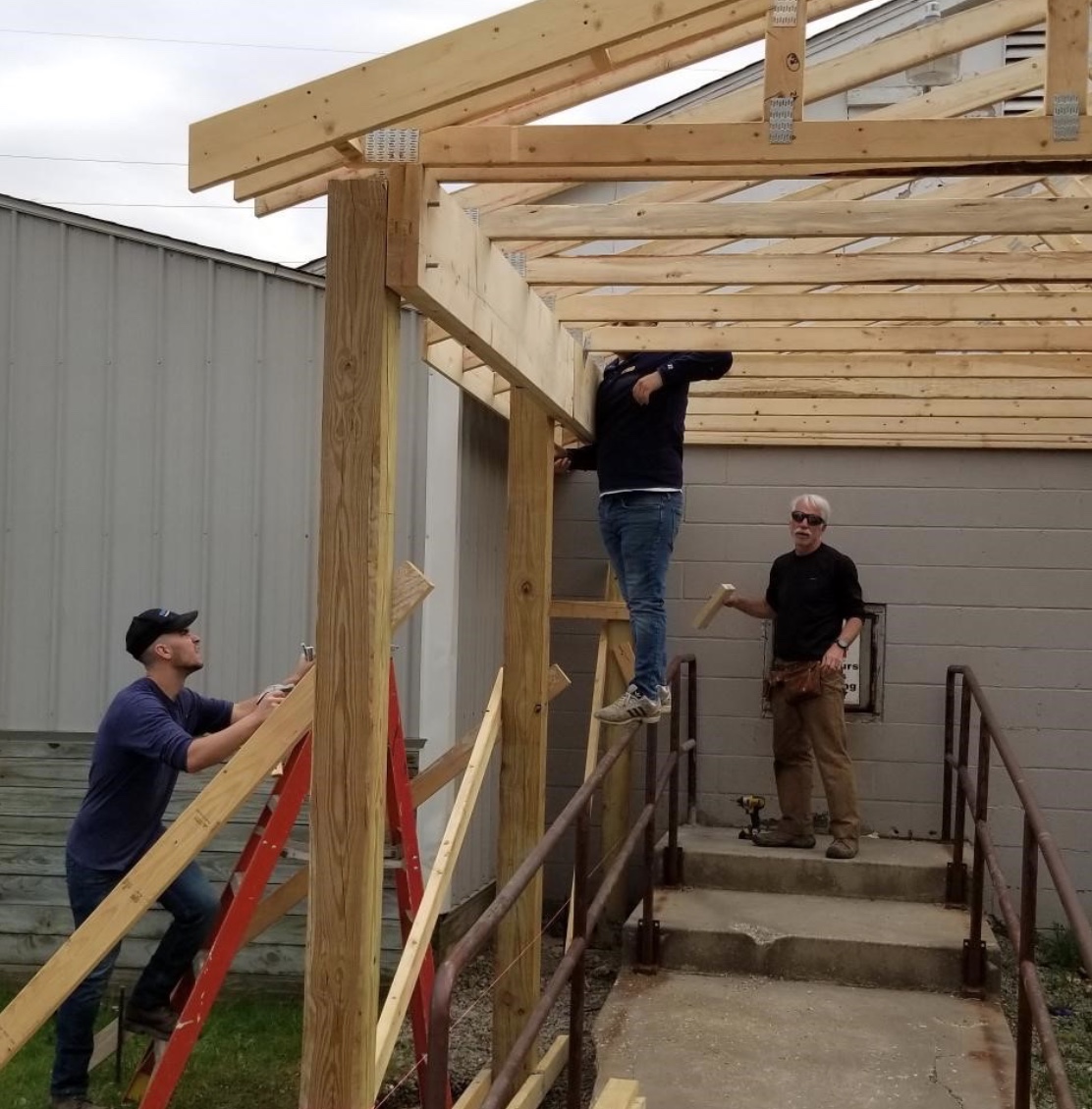 Phyllis Zumkehr Portage County Clothing Center Entrance Shelter by the Kent State University College of Architecture and Environmental Design (CAED) Construction Management Student Organization The Phyllis Zumkehr Portage County Clothing Center accepts donations during their open hours: Monday- Friday 10am-2pm and Tuesday and Thursday evenings 6-8pm. However, the clothing center often receives donations when they are closed at the uncovered back entrance of the building. In order to protect items donated during off hours from elements, the Kent State University CAED Construction Management Student Organization helped build a shelter at the back entrance of the building in April and May of 2019. The CAED Construction Management Student Organization teamed up with Julie Brandle and Elizabeth Eaken of Metis Construction to help take on the project. The students were able to raise $4,000 of the $5,000 needed for the project, with the AGC Akron Division donating the remaining $1,000. Of the $5,000 about $600 was for permits and the rest was used for building materials to complete the project. With help from Kent State faculty advisor, Joe Karpinski, and Metis Construction, the team of Construction Management students were able to finish most of the labor in April. Karpinski enlisted the help of some Kent State faculty and alumni to finish the structure in May. Throughout the duration of the project, 20 different students participated for at least four hours or more.
