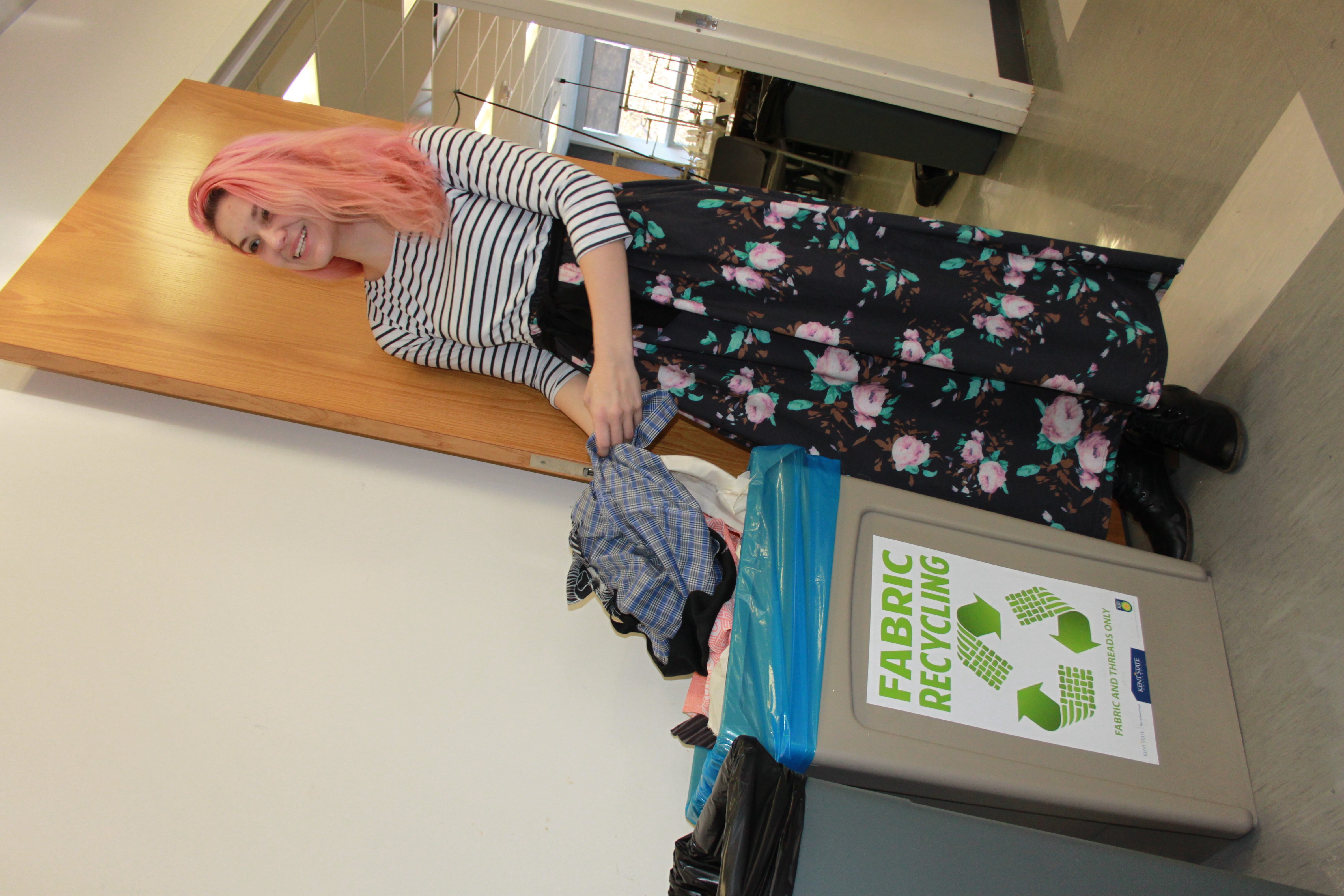 Fabric Scrap Recycling Fall 2017 The Kent State Fashion School, started collecting fabric scraps to measure how much fabric scraps Kent State was producing so the size of container needed would be determined. The fashion school made a display out of the fabric scraps. The Office of Sustainability was researching options for fabric scrap recycling vendors and coordinated with Ohio Mills Corporation, based in Cleveland, OH to set up fabric scrap recycling at Kent State in January 2018. Fabric Scrap bins and posters were ordered and placed in the Fashion School building. Spring 2018 Ohio Mills Corporation delivers fabric scrap recycling bin in January. Kent State University professors and students start recycling fabric scraps from the classroom into the fabric scrap recycling bin. The Fashion School also coordinated with local non-profit Socially Responsible Sweatshop, from January 2018 through the current date giving first choice of fabric scrap reuse to the Socially Responsible Sweatshop before sending fabric scraps for recycling. The Socially Responsible Sweatshop, a non-profit based in Kent, OH, repurposes landfill-destined textiles into useful items and proceeds from the sales of these items are donated to provide extra funds for food-insecure community members and other social justice projects. Fabric Scrap donation and recycling at the Kent State University Fashion School continues as an ongoing program.