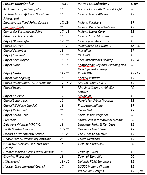 • Select and Secure Partnerships: partner applications are evaluated by a team of internal University partners including Sustain IU staff, ERI staff, and sustainability staff or faculty from IU regional campuses. Partner organizations are selected based on the quality of their application (primarily), as well as their ability to contribute to the overall ISDP program—either through financial support or by helping with student training. The final list of partner organizations is complete by mid-December.