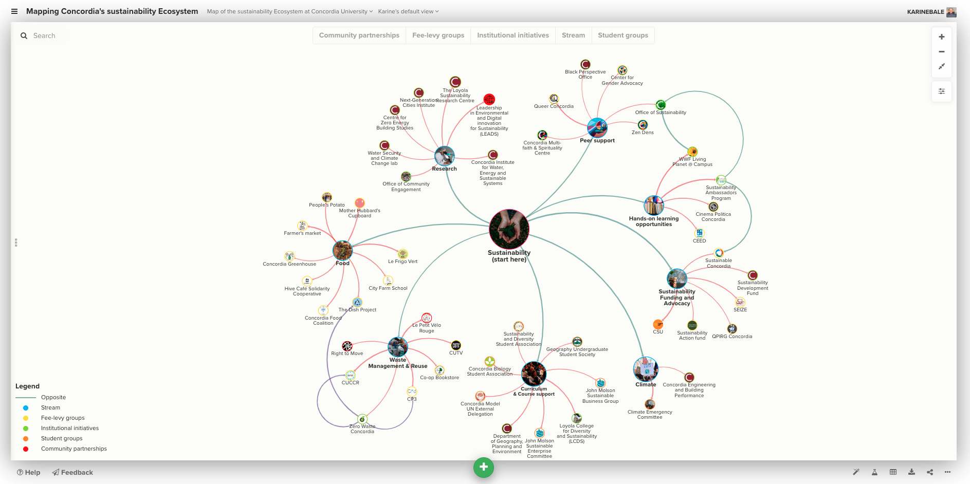 Tristan Harris, the founder of the Center for humane Technology, once said: "Our ability to meet the world's challenges depends on us making sense & coordinating together." It means that to address the challenges of the 21st century, we need to create a common framework for "making sense" of the current situation. This is where the importance of mapping sustainability comes in. At Concordia University, we have a complex and ever-changing web of institutional initiatives, student groups, and fee-levy that interact and advance our sustainability efforts. Complexity can often equate to chaos; one way to make sense of the mess is to apply system thinking to identify underlying patterns (Burnes, 2005). Using this framework, I built a representation of sustainability at Concordia that is simple enough to be grasped by our minds and detailed enough to inform decision-making. By building a map of Concordia's sustainability ecosystem, I am bringing clarity to what is available for students and the community. I am also highlighting weaknesses in the system for decision-making purposes.